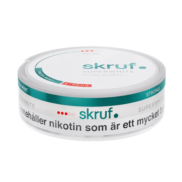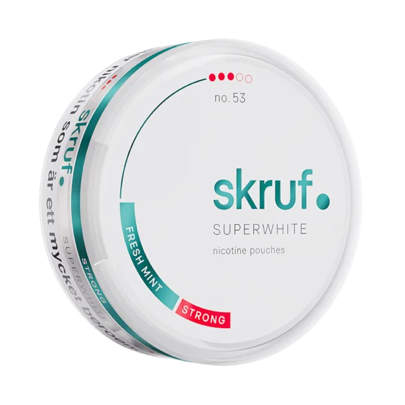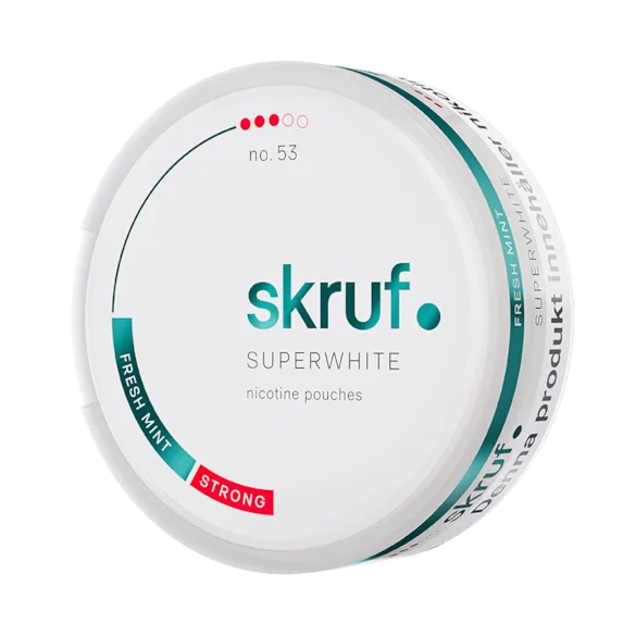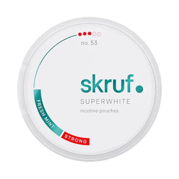Skruf Superwhite No.53 Fresh Mint Strong från Skruf Superwhite, tillverkad av Skruf Snus, är ett vitt snus. Produkten kommer i slim-format, är tobaksfri men innehåller nikotin och klassas som stark.