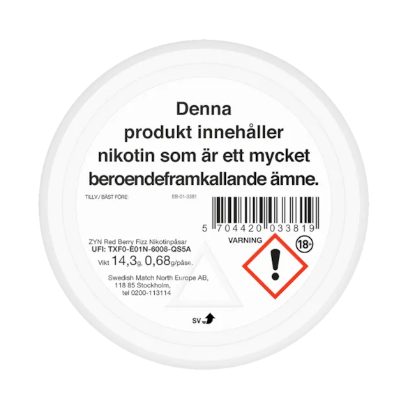 ZYN Red Berry Fizz S4 från ZYN, tillverkad av Swedish Match, är ett vitt snus med smak av Röda bär, citrus, bär i extra stark styrka i slim-format. Varje dosa innehåller 21 portioner.